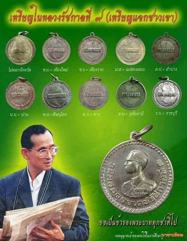 เหรียญที่ ระลึกสำหรับชาวเขา" ด้านหน้าเป็นพระบรมรูป ร.9 ด้านหลังเป็นรูปแผนที่ ประเทศไทย โดยมีการตอกชื่อย่อจังหวัด และหมายเลขประจำตัวลงในแต่ละเหรียญ เพื่อใช้เป็นหมายเลขประจำตัวสำหรับชาวเขาแต่ละคน พระองค์ได้ทรงนำเหรียญเหล่านี้ไปพระราชทานแก่ชาวเขาตามจังหวัดต่างๆ ประมาณ 20 จังหวัด รวมทั้งหมดกว่า 200,000 เหรียญ โดยทุกเหรียญจะมีอักษรย่อของแต่ละจังหวัดตอกอยู่ที่ด้านหลังเหรียญ พร้อมทั้งมีหมายเลขประจำเหรียญตอก กำกับอีกด้วย ดังนี้