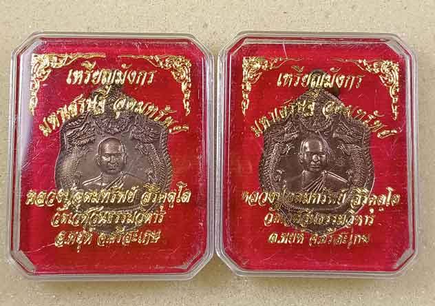 เหรียญมังกรคู่ มหาเศรษฐี อุดมทรัพย์ หลวงปู่อุดมทรัพย์(จ่อย) จ.ศรีสะเกษ 2 เหรียญ กล่องเดิม |