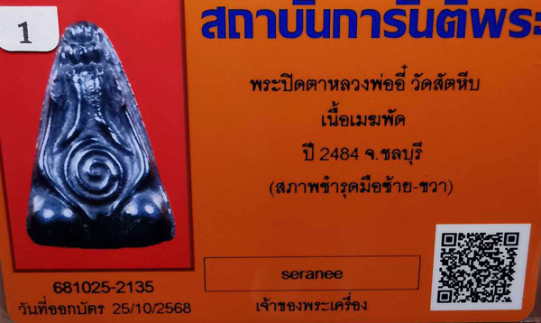 พระปิดตาหลวงปู่อี๋ วัดสัตหีบ เนื้อเมฆพัด ปี2484 จ.ชลบุรี + บัตรG-pra สภาพพระระบุตามบัตรรับรอง สภาพตามรูปทุกประการค่ะ