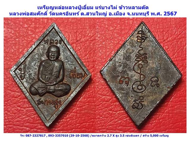 เหรียญหล่อหลวงปู่เอี่ยม แร่บางไผ่ ข้าวหลามตัด หลวงพ่อสมศักดิ์ วัดนครอินทร์ ต.สวนใหญ่ อ.เมือง จ.นนทบุรี พ.ศ. 2567
