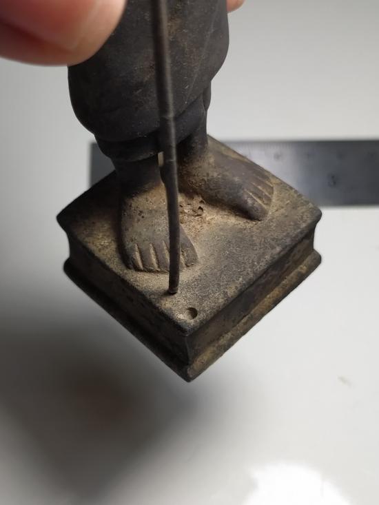 มุมฐานด้านหน้าขวาขององค์พระ มีรูเจาะตื้น ๆ ไว้สำหรับให้ไม้เท้าลงล็อคครับ