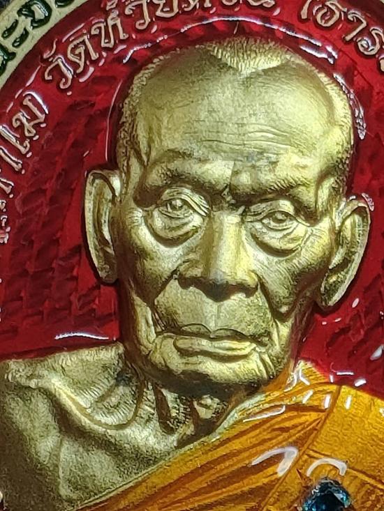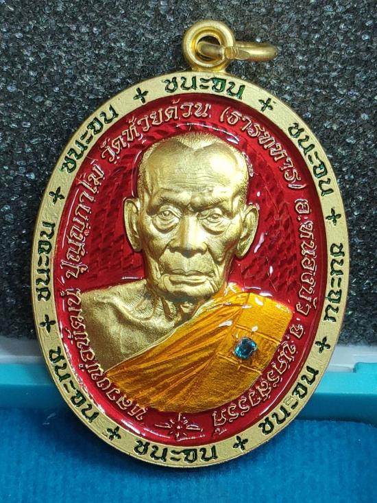 เหรียญชนะจน 65 หลวงพ่อพัฒน์ วัดห้วยด้วน เนื้อชนวนกะไหล่ทองเจาะห่วง ลงยาแดง ลงยาจีวร ฝังพลอยฟ้า เลข83 สองหลักสวยๆ จมูกร้อย กล่องเดิม