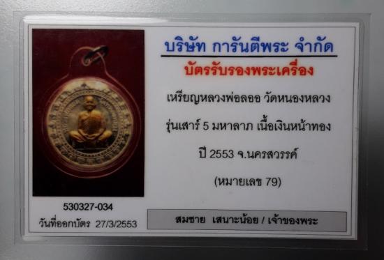 เหรียญมหาลาภรุ่นแรก หลวงพ่อลออ วัดหนองหลวง รุ่นเสาร์๕ ปี2553 เนื้อเงินหน้าทอง จำนวนสร้าง 199 เหรียญ มีโค๊ตด้านหลังและขอบเหรียญ หมายเลข#79 พร้อมเลี่ยมพลาส ติกกันน้ำและบัตรรับรองg-pra