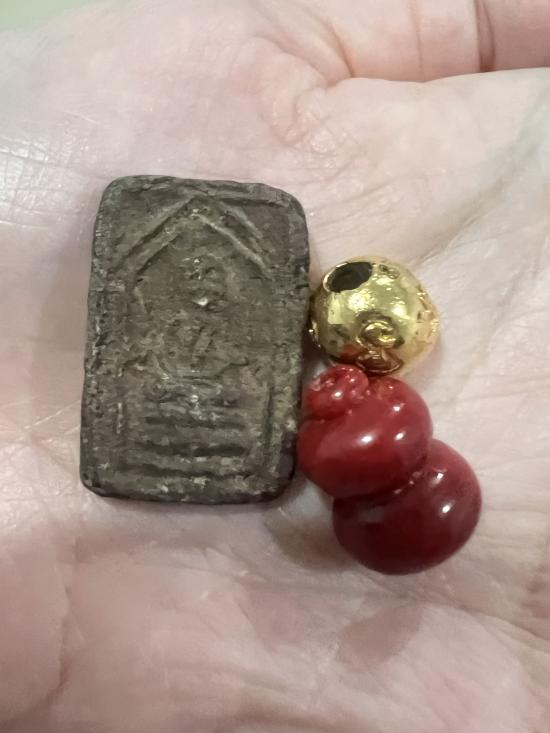 มีลูกอมเจาะรูเนื้อโลหะ มีอักขระรอบลูกอม มีน้ำเต้าเจาะรูหัวท้าย และมีพระพิมสี่เหลี่ยม