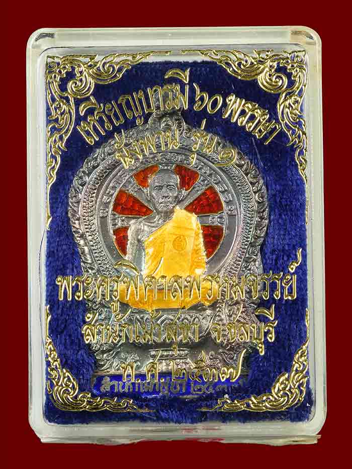 วัดใจ เหรียญนั่งพานรุ่นแรก หลวงพ่อสวัสดิ์ วัดเม้าสุขา เนื้อเงินลงยา ปี37 สภาพสวยเดิมตากล่อง เลข25
