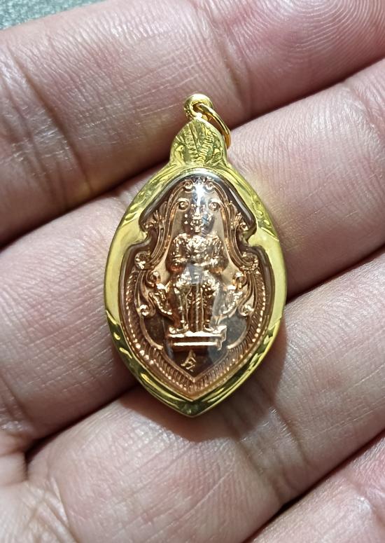 เหรียญท้าวเวสสุวรรณโณหลวงพ่ออิฏฐ์ วัดจุฬามณี พิมพ์ใบสาเก เนื้อทองแดง ปี2559 เลี่ยมทองแท้ 75%
