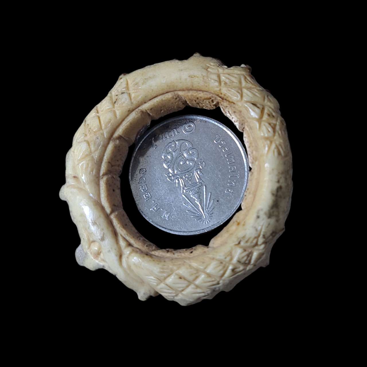 วัดใจ 9 บาท เครื่องรางทรงกลมลักษณะคล้ายแหวน แกะลาย ไม่ระบุวัสดุที่ใช้ทำ มีชำรุดตามภาพ |