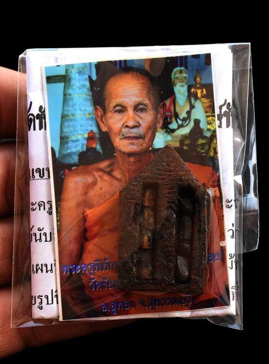 พระขุนแผนแขนอ่อน หลังฝังรักยม เนื้อผงมวลสารคลุกน้ำว่าน ปี 2555 พระครูน้อย วัดชัยมงคล จ.สุพรรณบุรี พร้อมซองรูปใบฝอยเดิมจากวัด |