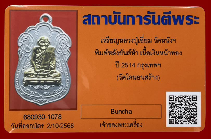 !!!...เหรียญหลวงปู่เอี่ยม วัดหนังฯ ปี2514 พิมพ์หลังยันต์ห้า เนื้อเงินหน้ากากทองคำ ออกวัดโคนอน สร้างน้อย หายาก สภาพสวย พร้อมบัตรรับรองครับ...!!! |