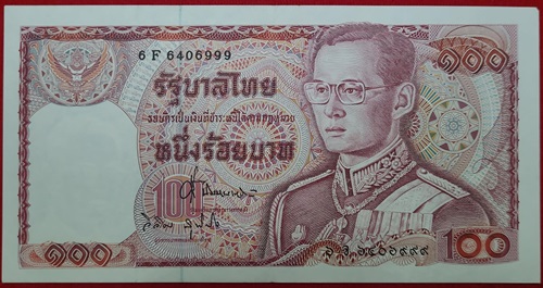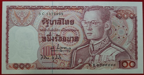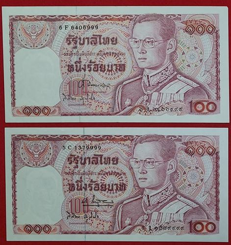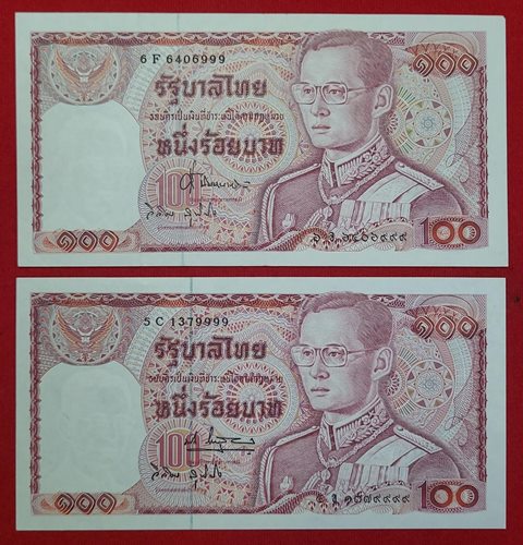 ธนบัตร 100 บาท ในหลวงรัชกาลที่ 9 แบบ 12 ด้านหลังช้างแดง เลขสวย 999 และ9999 สภาพ สวย,ใหม่,ไม่ผ่านการใช้ ลายเซ็น พนัส-วิจิตร หมายเลข 3C1379999,และ ลายเซ็น ธารินทร์-วิจิตร หมายเลข 6F6406999