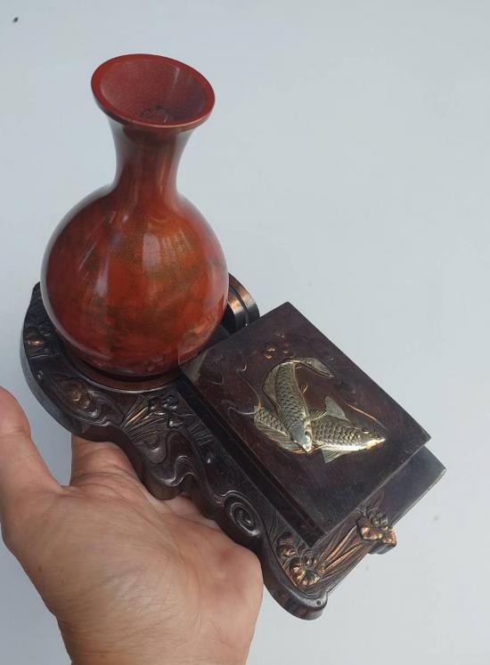 แจกันเก่าเก็บเนื้อทองเหลืองลงยา (มูราชิโด)งานของญี่ปุ่น สีส้ม ลายทอง ขนาด สูง 5 นิ้ว กับกล่องเก็บเครื่องประดับโบราณ เนื้อทองแดง |