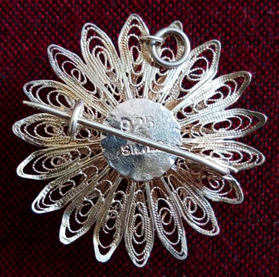 เข็มกลัดติดเสื้อและจี้ในตัว เงินแท้ ทรงดอกรักเร่ ขนาดประมาณ 1 นิ้ว 1 หุน หนักประมาณ 3.5 กรัม เป็นทั้งเข็มกลัดติดเสื้อ และจี้ห้อยคอ ด้านหลังตอก SILVER 925 ชัดเจน งานฝีมือถักขดเส้นเงินสุดประณีต งานโบราณงดงาม สภาพสวยตามรูป ส่งฟรีทั่วไทย รับประกันตามกฎครับ |