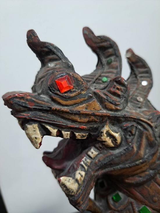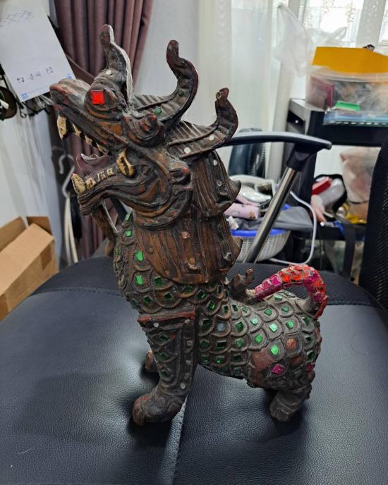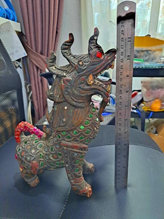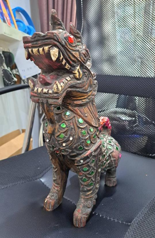 ราชสีห์ หรือ สิงห์ แกะจากไม้ ขนาดตัวสูลง 12 นิ้ว ทำจากไม้ทั้งตัว ฝังกระจกสี ไม่ทราบที่ ได้บ้านๆมาครับ