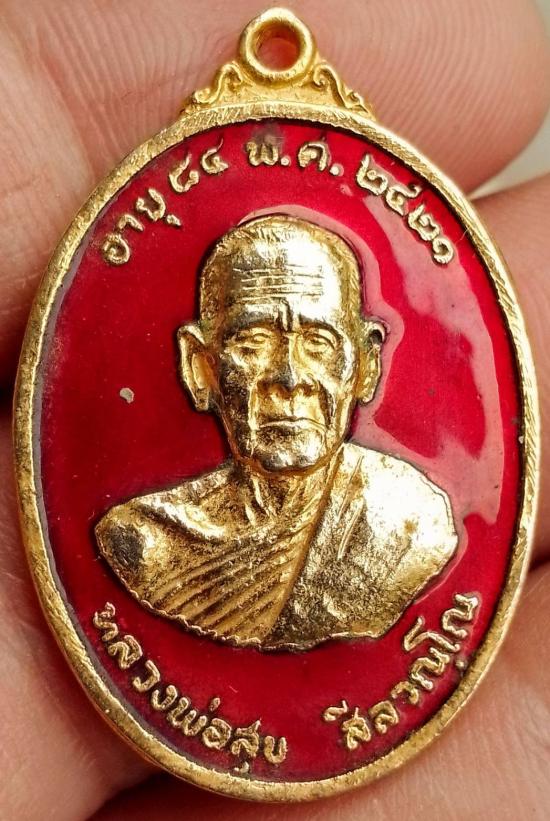 เคาะเดียวแดง.....เหรียญหลวงพ่อสุข วัดนารายณ์ บุรินทร์ จังหวัดสุรินทร์ ฉลองอายุ 84 ปี พ.ศ 2521 เนื้อกะไหล่ทองลงยาแดง |