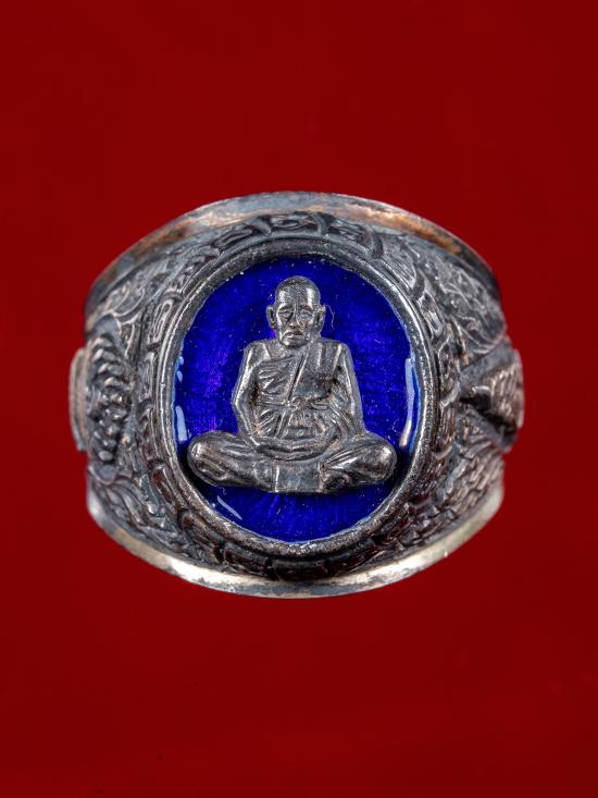 แหวนหน้าแหวนรูปเหมือน หลวงปู่ชื้น วัดญาณเสน จ.พระนครศรีอยุธยา เนื้อเงินลงยาสีน้ำเงิน ปี 2545 ตอกโค๊ด ใต้ท้องวงมีจาร |