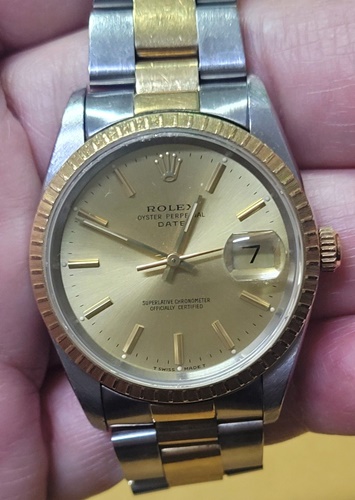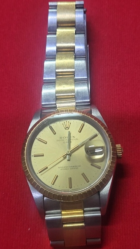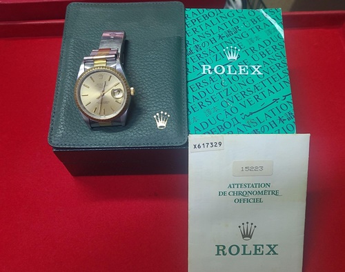 รายละเอียด Gent's RoLex,Date Oyster Perpetual 18k gold and steel,model:15223,Oyster bracelet,dial champagne 10 index Serial no:X617329 นาฬิกาโรเล็กซ์ ระบบ ออโตเมติค (มือสอง) ซื้อใหม่จาก สวิสเซอร์แลนด์ ห้าง BUCHERER มีใบ GARANTEE จากห้างฯที่ขาย