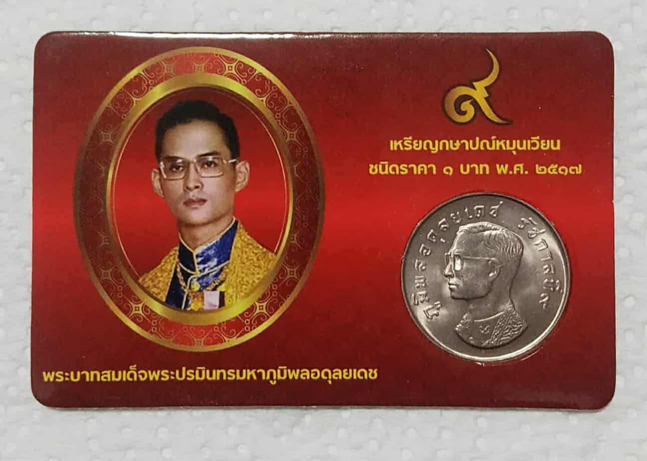 เหรียญ 1 บาท หลังครุฑ พ.ศ.2517 ในสมัยรัชกาลที่ 9 พร้อมการ์ดสีแดง พกติดตัวไว้เป็นมงคล เหรียญสภาพไม่ผ่านการใช้งาน จำนวน 1 เหรียญ ครับ ((ด้านก้อยพระเศียรเอียง อยู่ประมาณตรงเลข 7 ครับ)) |