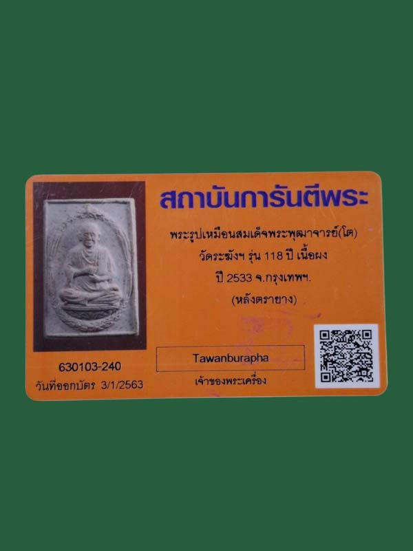 สมเด็จวัดระฆัง อนุสรณ์ 118ปี พ.ศ.2533 พิมพ์รูปเหมือน หลังปั้มตรายาง...พร้อมบัตรรับรอง |