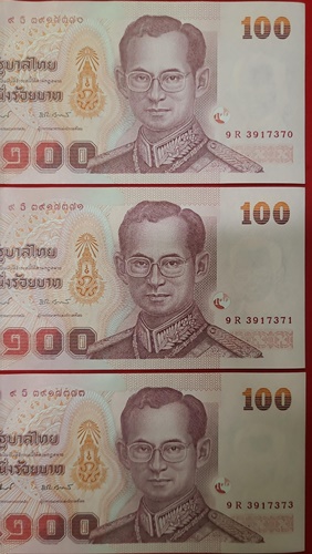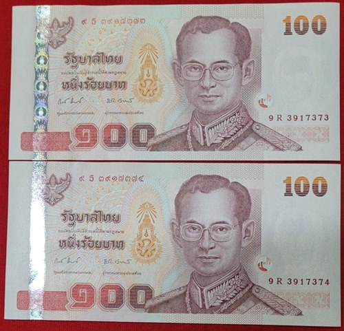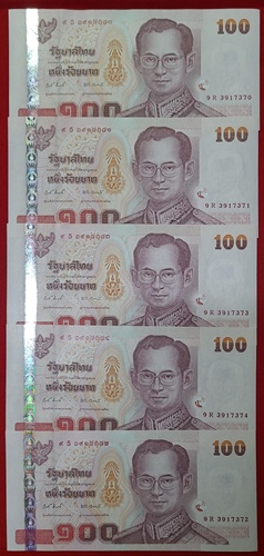 ธนบัตรที่ระลึก 100 บาท ร.9 ครบ 60ปี วันบรมราชาภิเษก และวันราชาภิเษกสมรส พ.ศ.2553 สภาพ UNC เลขเรียง 5ฉบับ #2 |