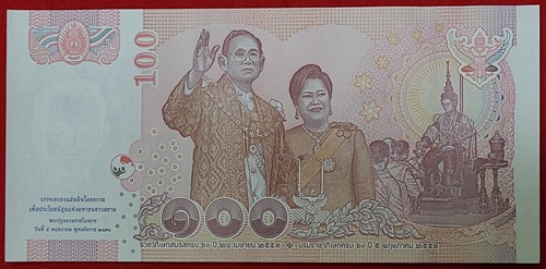 ธนบัตรที่ระลึก 100บาท ในหลวงรัชกาลที่ 9 ครบ 60ปี วันบรมราชาภิเษก และวันราชาภิเษกสมรส เมื่อปี 2553 จำนวน 5ฉบับ เลขเรียง สภาพใหม่ UNC หายาก |