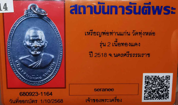 เหรียญพ่อท่านแก่น วัดทุ่งหล่อ เนื้อทองแดง ห่วงเดิม ปี2518 จ.นครศรีธรรมราช + บัตรG-pra สภาพสวยเดิมค่ะ สภาพตามรูปทุกประการค่ะ