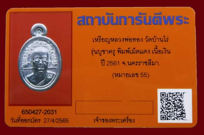 แดงที่เคาะแรก !!! เหรียญเม็ดแตง เนื้อเงิน รุ่นบูชาครู หลวงพ่อทอง วัดบ้านไร่ ปี2561 (หมายเลขสวย 55)+ บัตรพระแท้