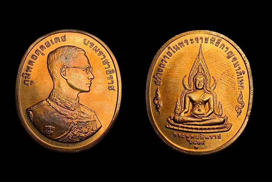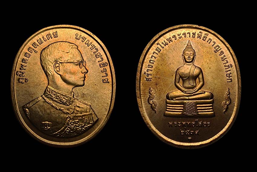 พระเหรียญชุดพระพุทธปัญจภาคี ครบชุด 5 เหรียญ เนื้อทองแดงผิวไฟ ที่ระลึกพระราชพิธีกาญจนาภิเษก ในหลวงรัชกาลที่ 9 หลังหลวงโสธร, หลังพระพุทธชินราช, หลังพระพุทธชินสีห์, หลังพระมงคลบพิตร, หลังพระนิรันตราย ปี