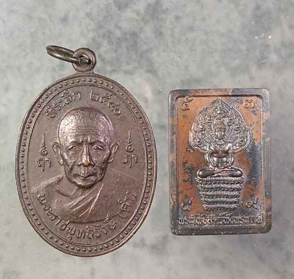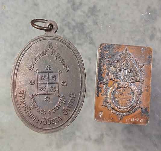 เหรียญพระราชพุทธิรังสี(หลวงพ่อดำ) วัดมุจลินทวาปีวิหาร(วัดตุยง) จ.ปัตตานี ปี2540 + เหรียญแสตมป์ปรก พระโพธิสัตว์พังพระกาฬ ไม่ทราบปี ตอกโค๊ด ตอกเลข |