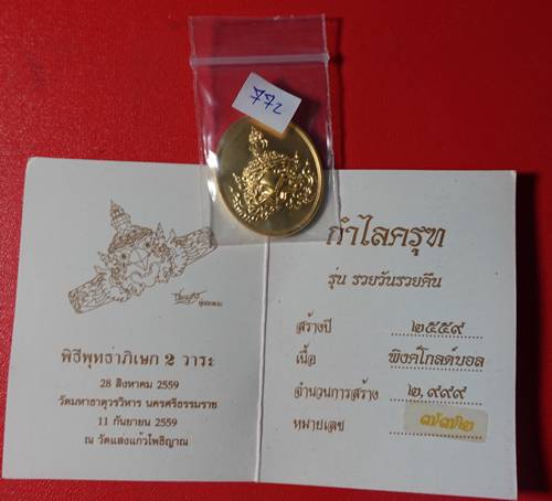 กำไลพญาครุฑ รวยวัน รวยคืน ปี 2559 หลวงพ่อวราห์ วัดโพธิทอง ครูบาอริยชาติ วัดแสงแก้วโพธิญาณ ปลุกเสก เนื้อพิ้งโกลด์บอล มีโค๊ดและหมายเลข ไม่ผ่านการใช้ มีกล่องเดิม |