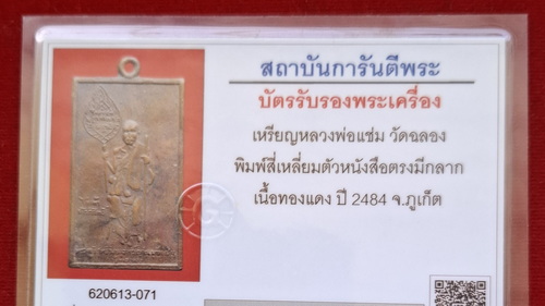เหรียญหลวงพ่อแช่ม วัดฉลอง พิมพ์สี่เหลี่ยมตัวหนังสือตรงมีกลาก เนื้อทองแดง ปี 2484 จ.ภูเก็ต