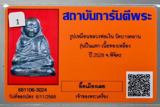 พระรูปหล่อโบราณ หลวงพ่อเงิน วัดบางคลาน รุ่นปืนแตก พิมพ์เศียรเล็ก เนื้อเก่า พ.ศ.2528 พร้อมบัตรรับรอง |