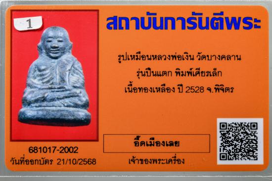 คัดสวย พระรูปหล่อโบราณ หลวงพ่อเงิน วัดบางคลาน รุ่นปืนแตก พิมพ์เศียรเล็ก เนื้อเก่า พ.ศ.2528 พร้อมบัตรรับรอง |