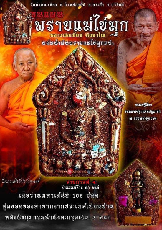พระขุนแผนพรายแม่ไข่มุก หลวงพ่อเมียน วัดจะเนียง บุรีรัมย์ หลวงปู่มหาศิลา (หลวงปู่ศิลา)อธิษฐานจิต เนื้อว่านมหาเสน่ห์108ชนิด ฝังตะกรุดเงิน2ดอกหลังฝังกุมารทอง จำนวนสร้างน้อยเพียง 99 องค์เท่านั้น มวลสารเข้มขลัง สวย หายาก ปัจจุบันวัตถุมงคล หลวงพ่อเมียนขยับราคาขึ้นทุกรุ่น พุทธคุณประสบการณ์ของพระเครื่องของท่านยิ่งมากและไม่ธรรมดา จนถึงประสบการณ์ที่ผู้บูชานับถือได้ประสบพบมากับตัวเองแล้วนั้นด้วย วัตถุมงคลหลวงพ่อเมียนประสบการณ์มากมาย ห้ามพลาดด้วยประการทั้งปวงแล้วครับ รับประกันชั้นหนึ่งครับ |