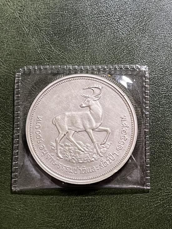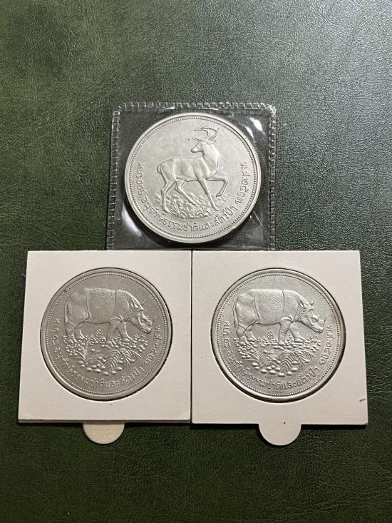 เหรียญเนื้อเงินที่ระลึกการอนุรักษ์ธรรมชาติและสัตว์ป่า ปี 2517 จำนวน 3 เหรียญ 100,50,50 เคาะเดียว
