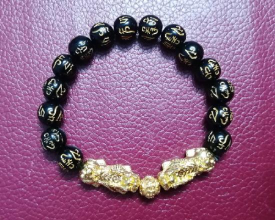 สร้อยประคำข้อมือปี่เซี๊ยะทอง+ลูกปัดลงอักขระทิเบต ขนาด 10 มิล พร้อมใบคาถาบูชาฯ (กท.92) |