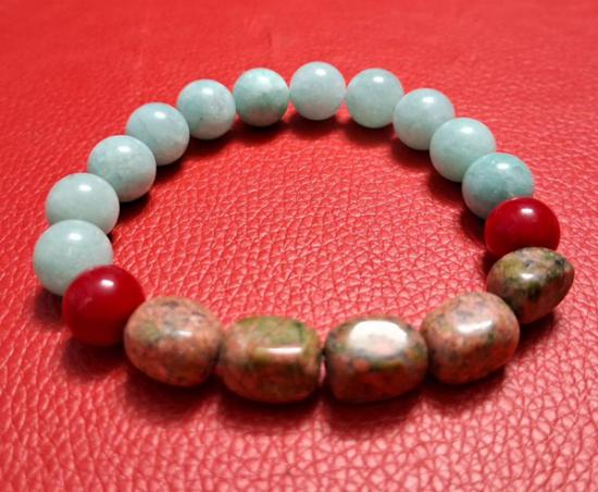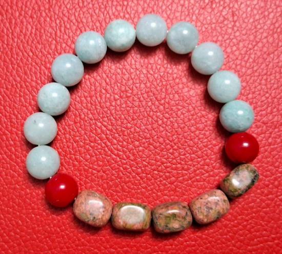 ประคำข้อมือหินปะการังแดง ขนาด 10 มิล+หินอความารีน ขนาด 10 มิล +หินยูนาไคต์ แบบเหลี่ยม (หินถูกหวย) หินแท้ 100 % ร้อยด้วยเอ็นยืด ขนาดฟรีไซด์ (กท.22)