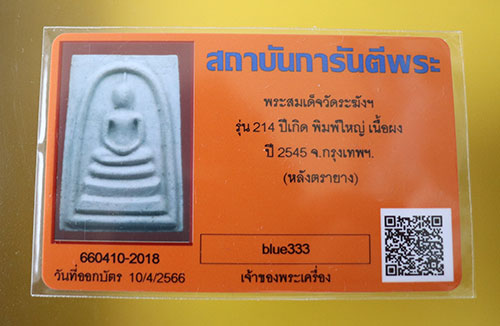 "เคาะเดียว" พระสมเด็จวัดระฆัง รุ่น 214 ปีเกิด พิมพ์นิยมเกศทะลุซุ้ม ปี 2545 พิธีใหญ่ หลวงปู่หมุน วัดบ้านจานร่วมปลุกเสก กล่องเดิมพร้อมบัตร G-pra#5 |