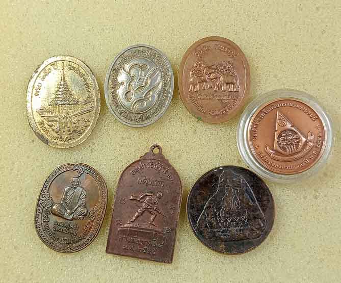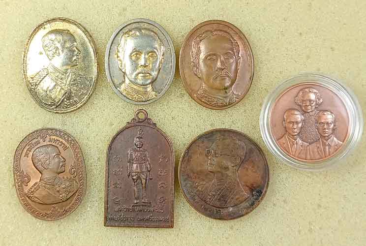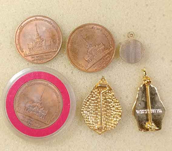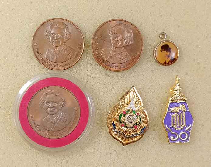 เหรียญร.5 4 เหรียญ + ล็อกเก็ตร.5+ เหรียญร.6 + เหรียญร.9 2 เหรียญ + เหรียญสมเด็จย่า 3 เหรียญ + เข็มกลัดภปร. + เข็มกลัดสธ. |