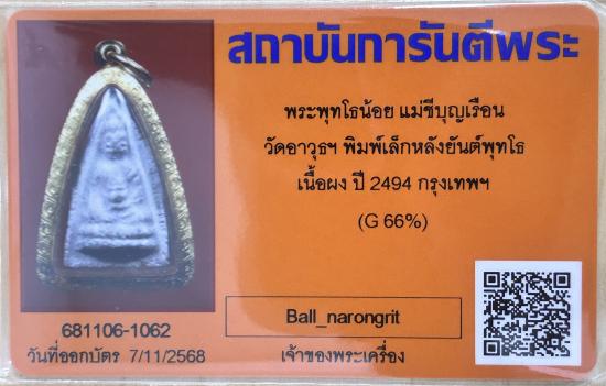 พระพุทโธน้อย แม่ชีบุญเรือน วัดอาวุธฯ พิมพ์เล็กหลังยันต์พุทโธ เนื้อผง ปี 2494 กรุงเทพฯ เลี่ยมทองหนา |