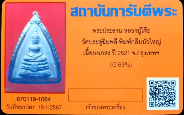 พระประธาน หลวงปู่โต๊ะ วัดประดู่ฉิมพลี พิมพ์กลีบบัวใหญ่ เนื้อผงเกสร ปี2521 เลี่ยมทอง63%+บัตร