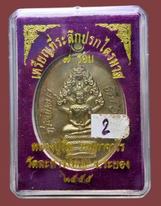 เหรียญปรกไตรมาส 7 รอบ หลวงพ่อสิน วัดละหารใหญ่ ระยอง เนื้อเอัลปาก้า หมายเลข 1802 พร้อมกล่อง |