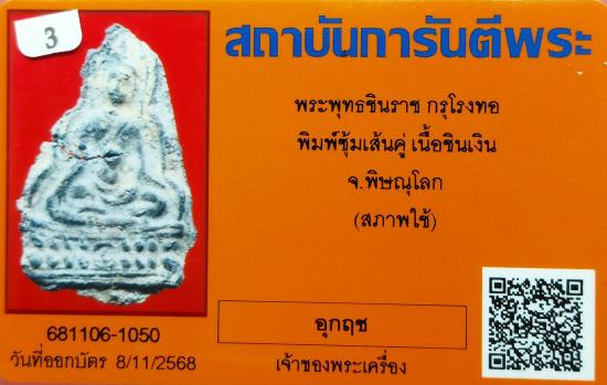ชื่อพระเครื่อง วัดใจ พระพุทธชินราช กรุโรงทอ(วัดโพธิญาณ) พิมพ์ซุ้มเส้นคู่ เนื้อชินเงิน จ.พิษณุโลก พร้อมบัตรรับรองจากจีพระ