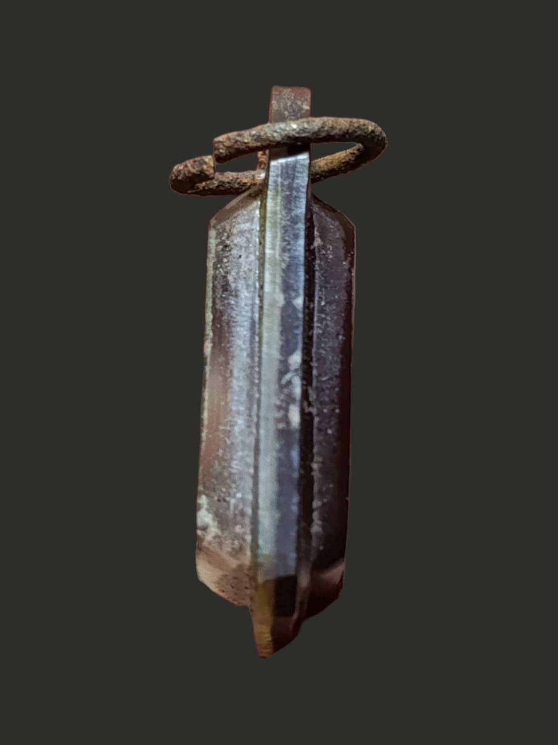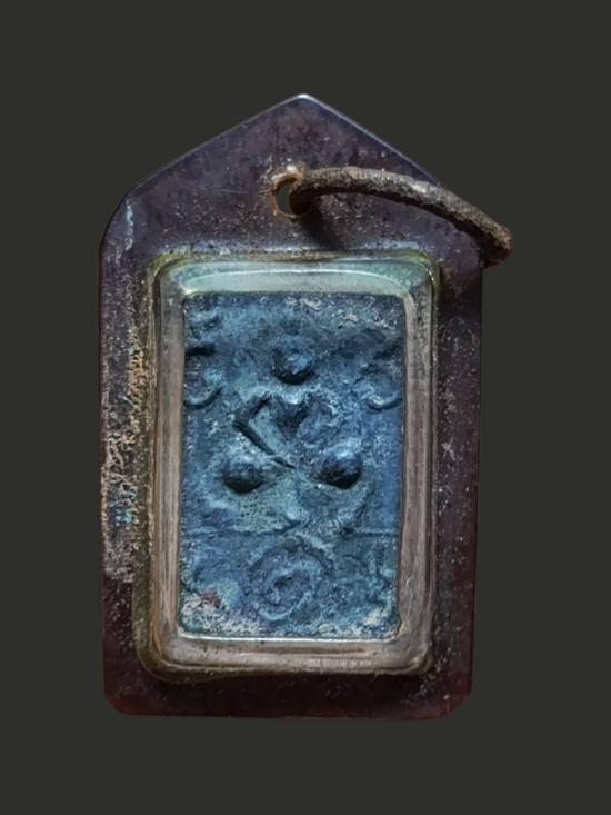 เหรียญหล่อโลหะเก่าๆด้านหลังมีจาร เลี่ยมกรอบพลาสติกสีน้ำตา ห่วงขึ้นสนิม เคาะเดียว |