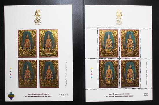 ชีทแสตมป์ออกในวาระครบรอบ 150 ปีในหลวง ร.๕ เคาะเดียว 800 บาทต่ำกว่าทุนครับ (ชีทแสตมป์ออกขายราคาแพงกว่าหน้าดวง 450+450=900 บาท) แสตมป์ทองดุนนูนพิมพ์ด้วยทองคำแท้