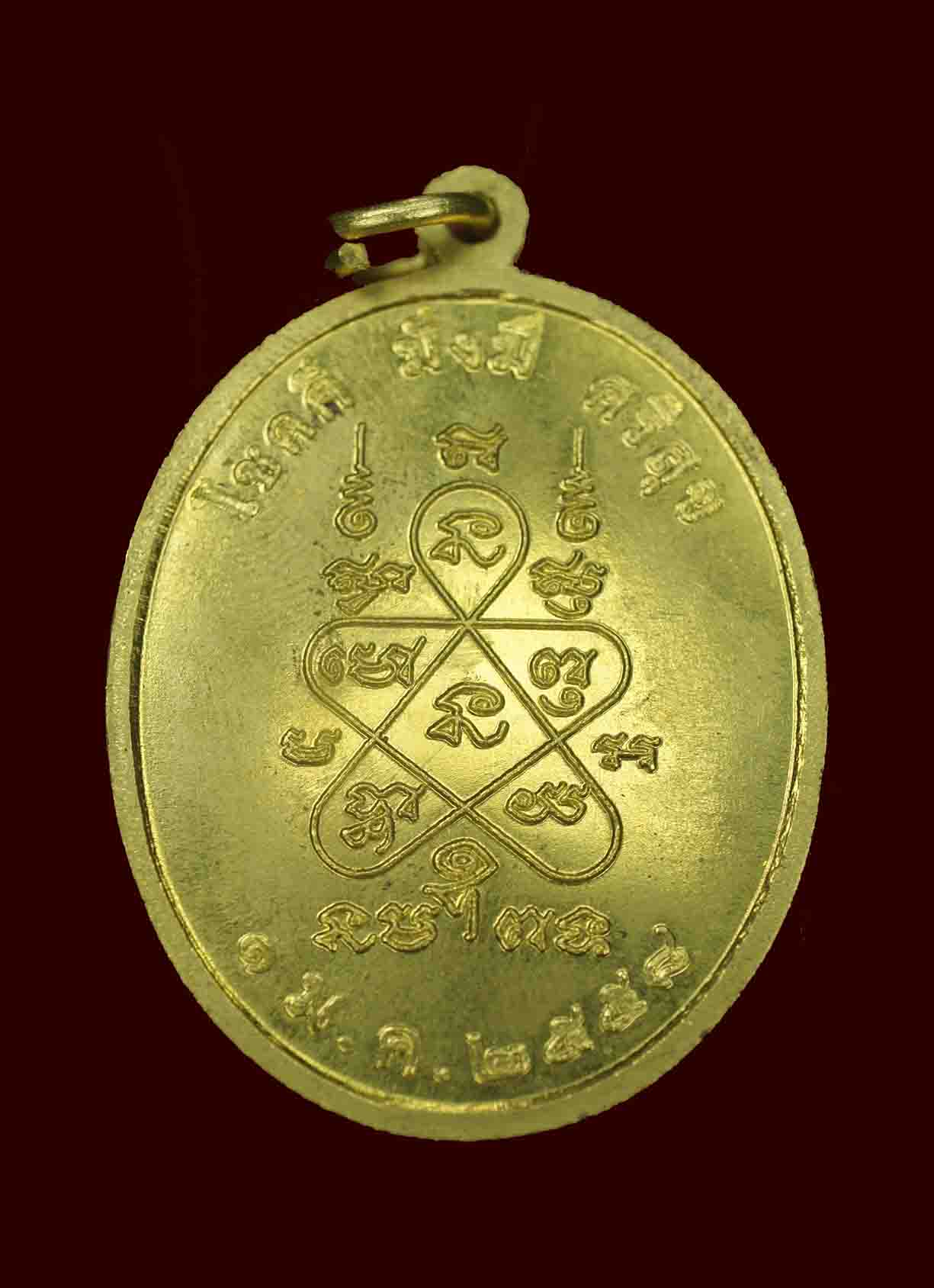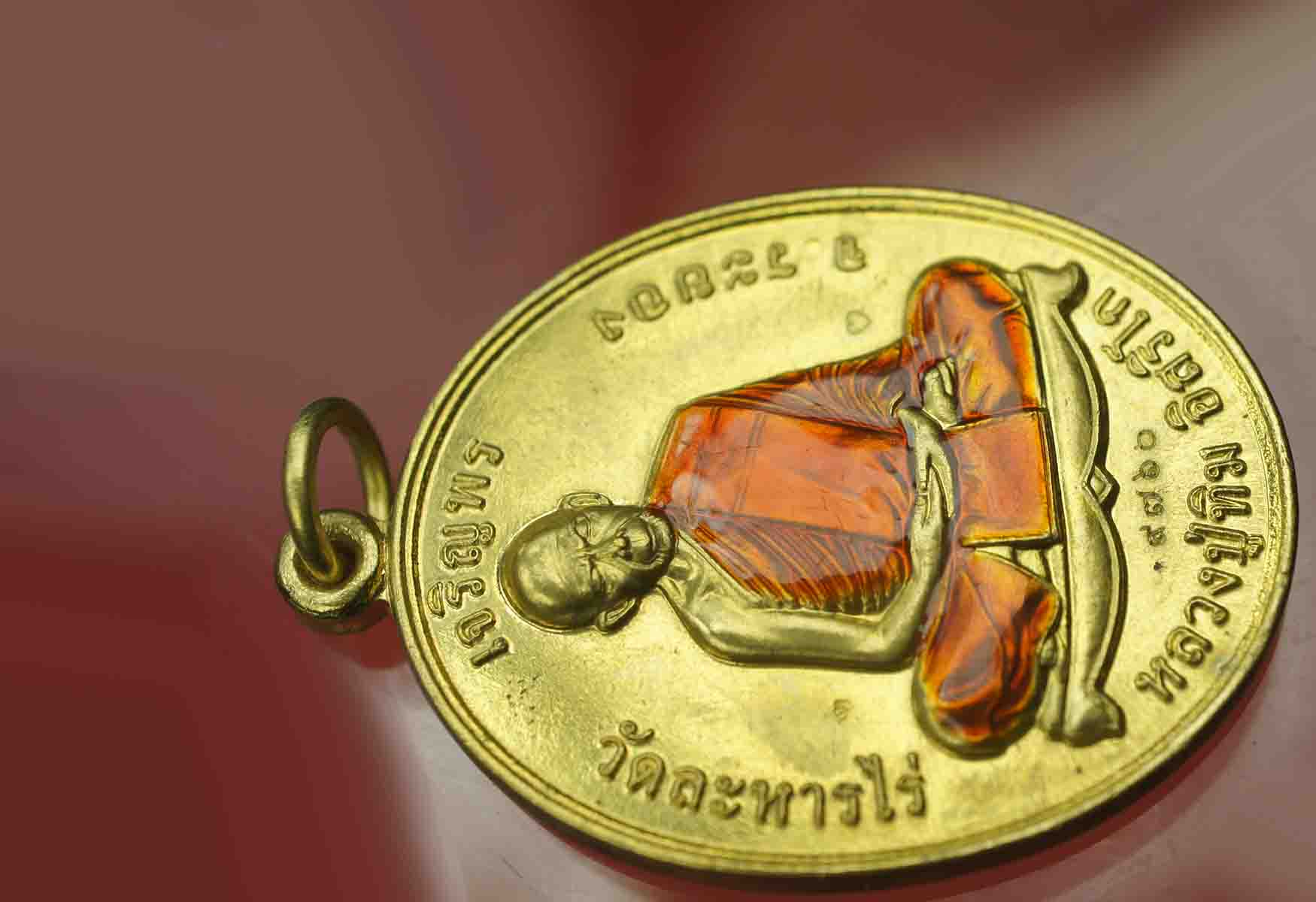 เหรียญโชคดี มั่งมีศรีสุข เนื้อทองฝาบาตร ลงยาจีวรเหลือง ปี 2557 หมายเลข **9760** ด้านหน้า ตอกโค๊ต หัวใจ โค๊ตตัว *ท* พิธีปลุกเสก โบสถ์ วัดละหารไร่ ระยอง พร้อมกล่องเดิมจากวัด |