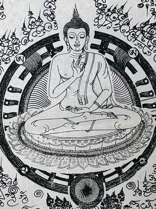 จัดไป....ผ้ายันต์พระพุทธธรรมจักรทิพย์ญาณไตรโลก วัดหนองระกำ อาจารย์หม่อมเขียนออกแบบยันต์ หลวงปู่ละมัยปลุกเสก ขนาด 112x47 ซ.ม. ผืนใหญ่ ชุดที่ 1 |