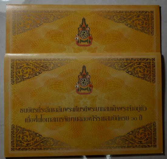 ธนบัตรที่ระลึก 60 บาท พระบาทสมเด็จพระเจ้าอยู่หัวรัชกาลที่ 9 ฉลองสิริราชสมบัติครบ 60 ปี 2 ใบ |