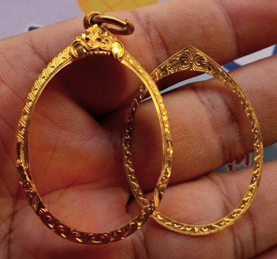 กรอบทองมือสอง งานสั่งทำสวยๆ สามารถใส่เหรียญยอดนิยมทั่วไปที่ไกล้เคียง หน้าจอกว้าง 2.55 ซม., สูง 3.35 ซม. น้ำหนัก 4.81 กรัม G75.55% เคาะเดียว