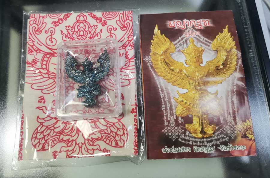 <>> พญาครุฑเพชรลังกา รุ่นแรก พ่อท่านเขียว วัดห้วยเงาะ เนื้อประกายรุ้ง หมายเลข ๖๘๗ สวยกริ๊ป อุปกรณ์ครบ ซีลเดิม <>> |