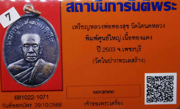 เหรียญหลวงพ่อทองสุข วัดโตนดหลวง พิมพ์ศูนย์ใหญ่ เนื้อทองแดง ปี2503 จ.เพชรบุรี (วัดในปากทะเลสร้าง)+ บัตรG-pra สภาพเดิมค่ะ |